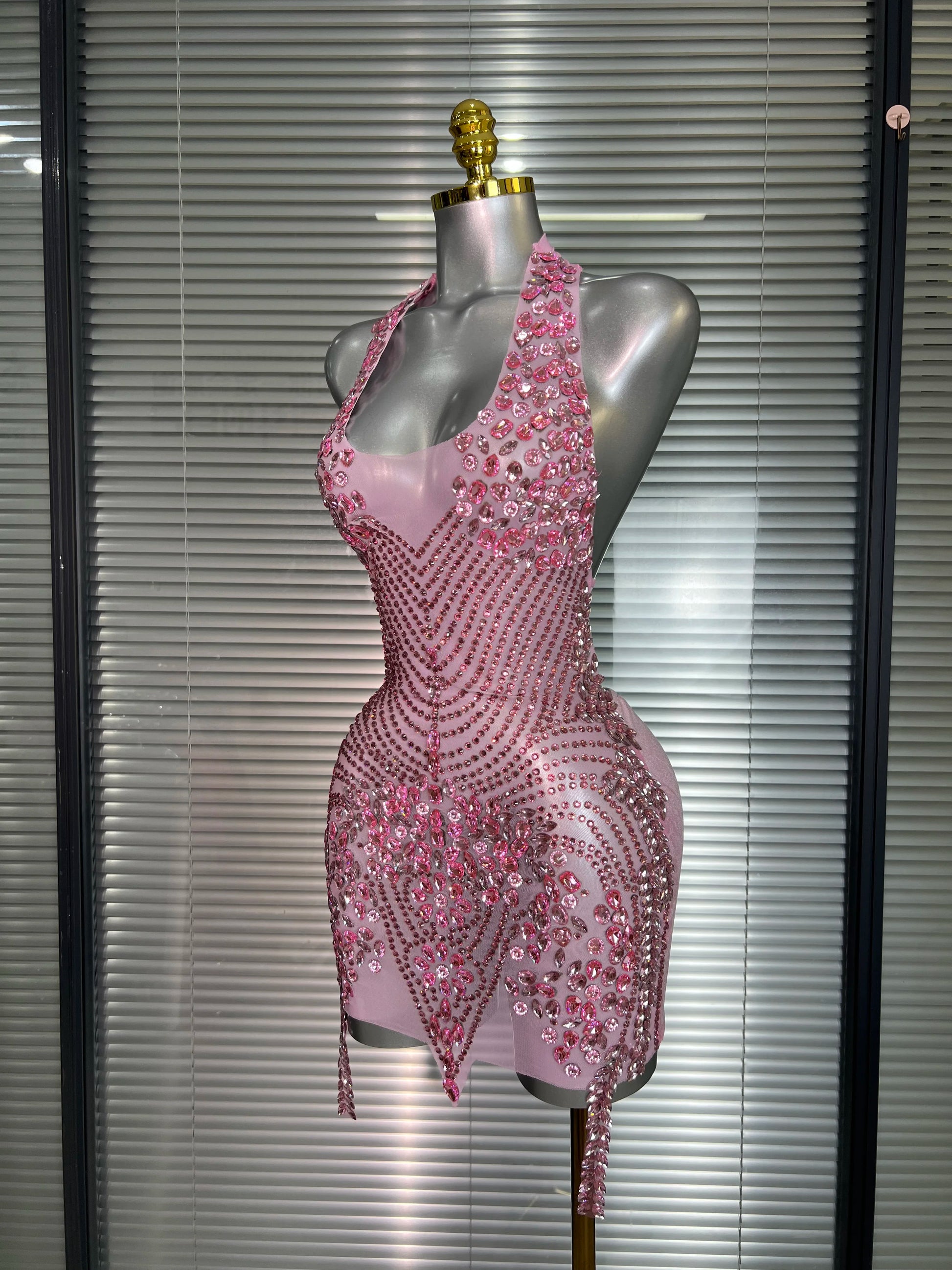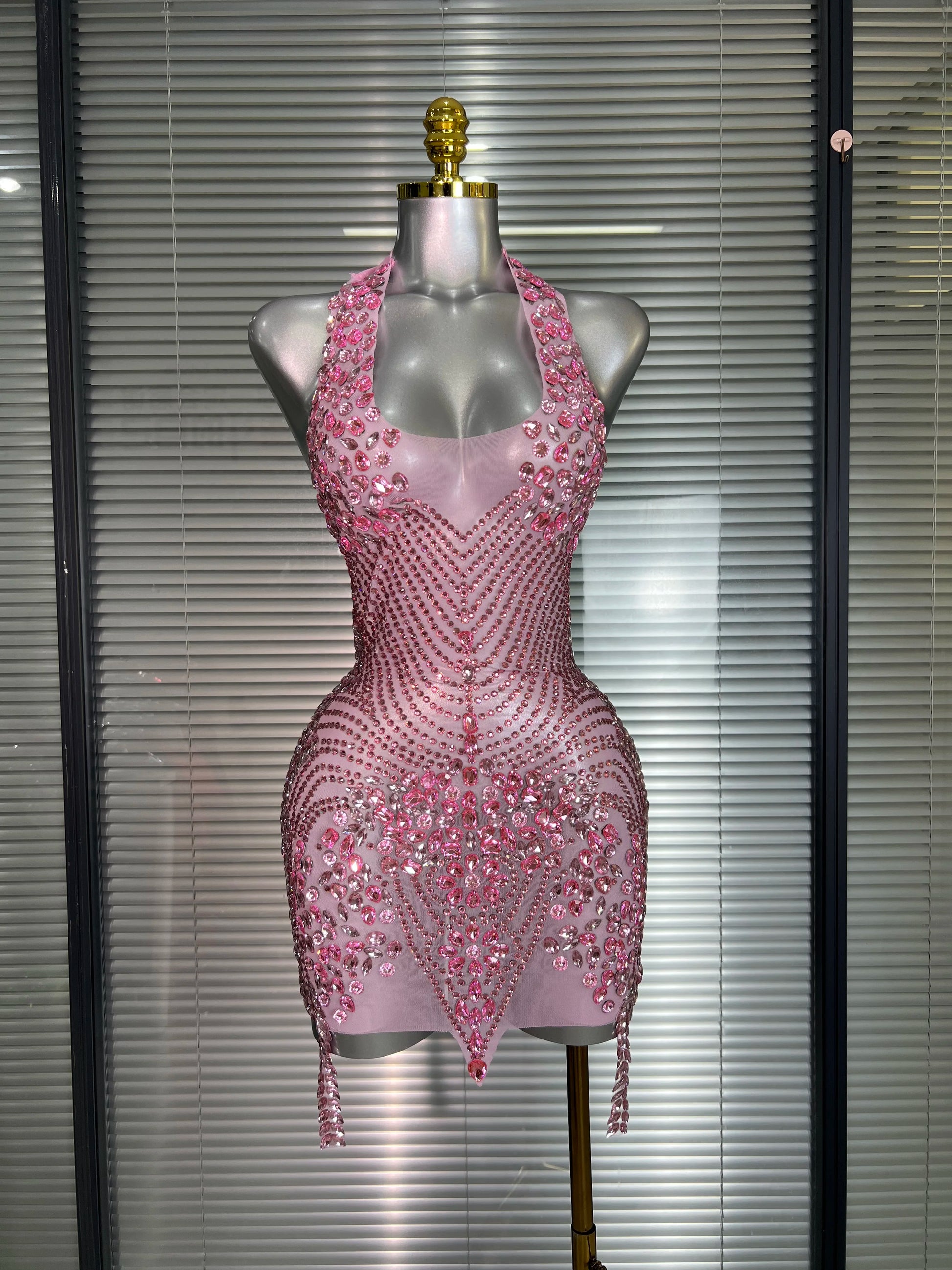 Steal the spotlight! This Sexy Pink Mesh Mini Dress features a dramatic Halter neck. The perfect Stage Performance Costume for a Dancer, Singer, or a dazzling Night Club Mini Party Dress outfit.
