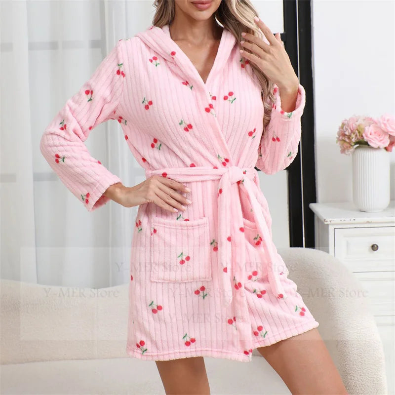 Snuggle up in this cozy Pink Hooded Robe! Made from Warm Coral Fleece, this Short Kimono Gown is incredibly soft. Perfect Intimate Lingerie, Sleepwear, and Bathrobe Nightwear for comfortable, yet Sexy Home Clothes.