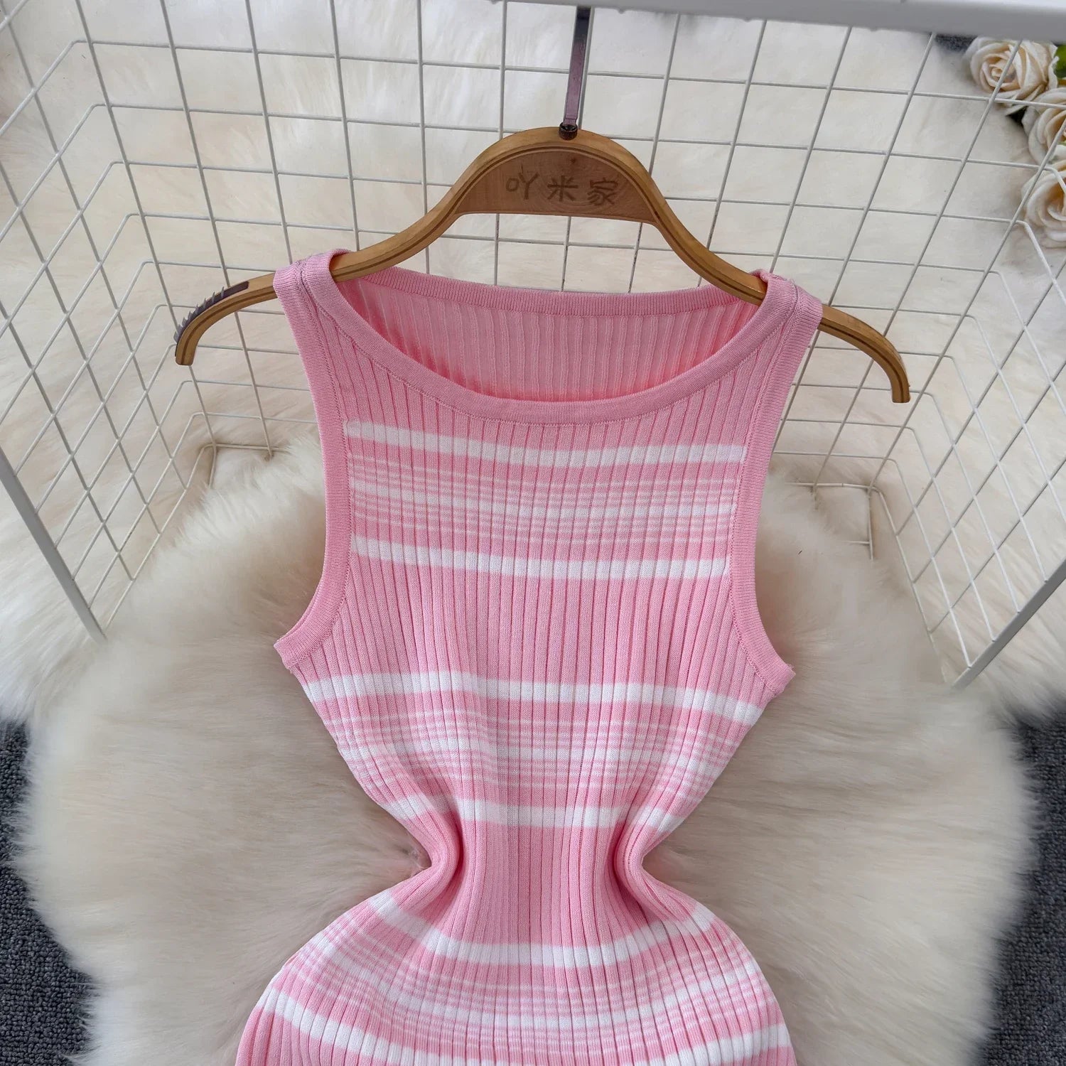 Perfect for your getaway! This Pink Stripe Knit Bodycon Dress is a Sexy Beach Vacation essential. The O-neck design and elastic material offer a Slim fit. A Casual Pencil Vestidos Maxi Long Dress ideal as a stylish Sundress for women.